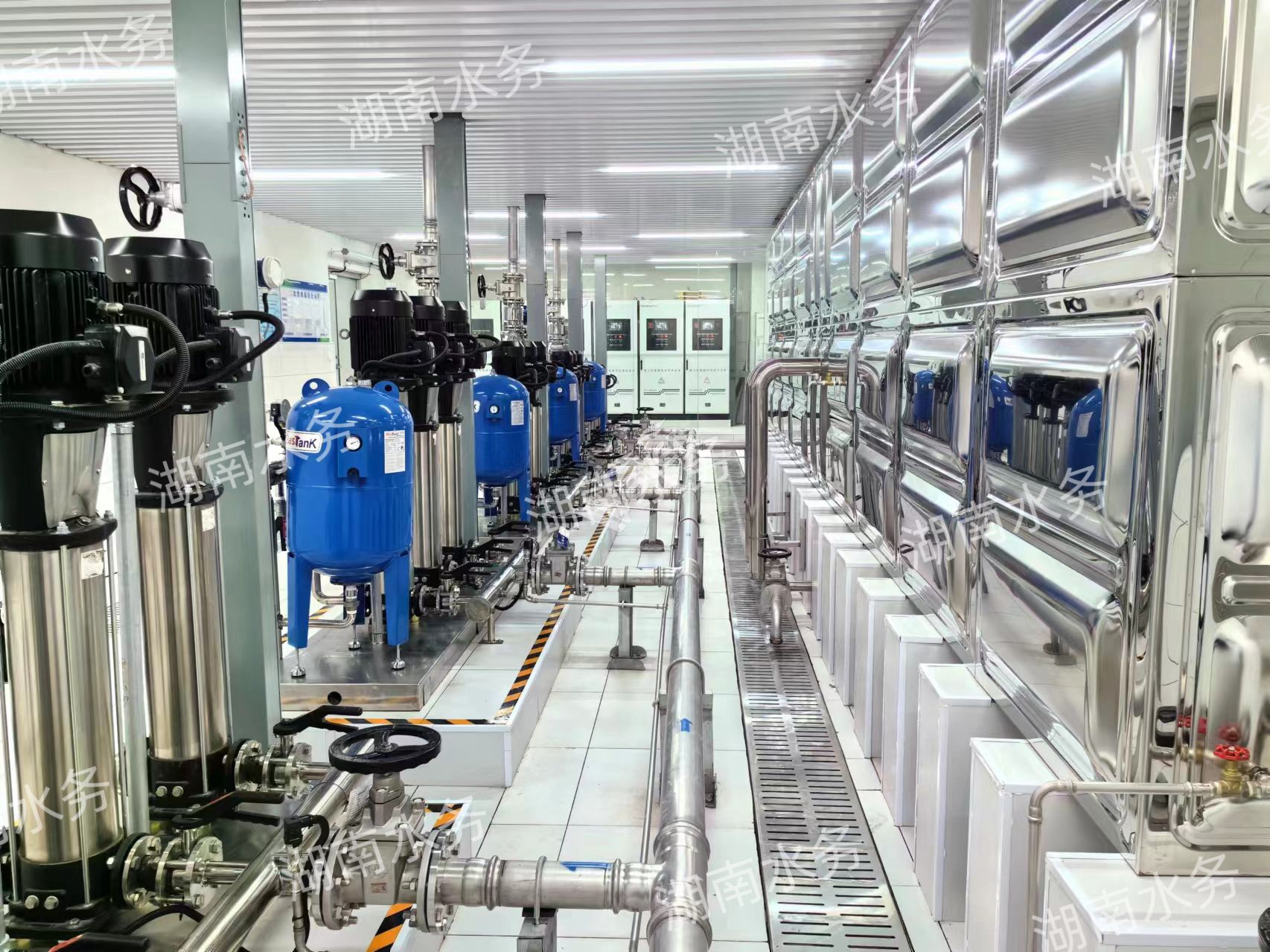 湖南水務(wù)機(jī)電的二次供水泵房由衛(wèi)生級(jí)不銹鋼水箱、數(shù)字化變頻控制柜、在線消毒設(shè)備、增壓泵組構(gòu)成。