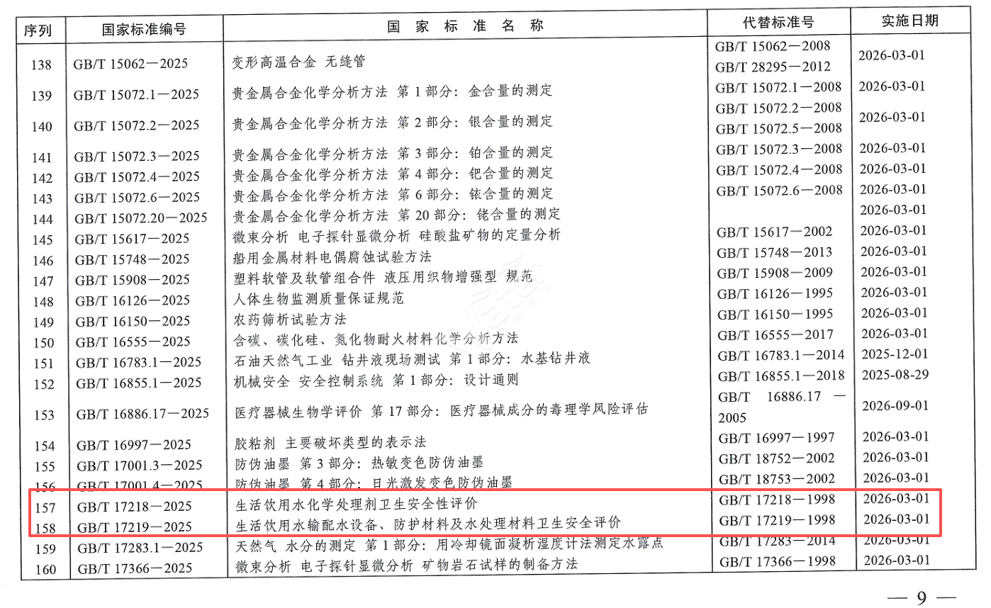 近日,國家市場監(jiān)督管理總局(國家標(biāo)準(zhǔn)化管理委員會)批準(zhǔn)發(fā)布了《生活飲用水衛(wèi)生標(biāo)準(zhǔn)》(GB 5749-2022)兩項(xiàng)重要的引用標(biāo)準(zhǔn)《生活飲用水化學(xué)處理劑衛(wèi)生安全性評價(jià)》(GB/T 17218-2025 )、 《生活飲用水輸配水設(shè)備、防護(hù)材料及水處理材料衛(wèi)生安全評價(jià)》(GB/T 17219-2025),并將于2026年3月1日開始實(shí)施。